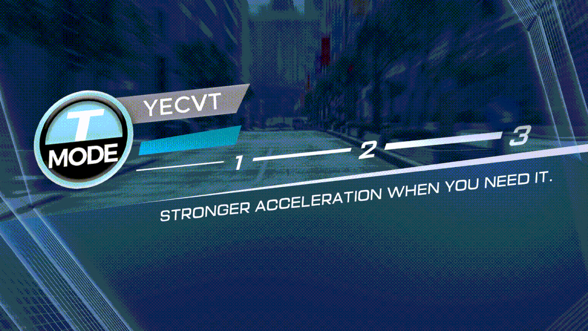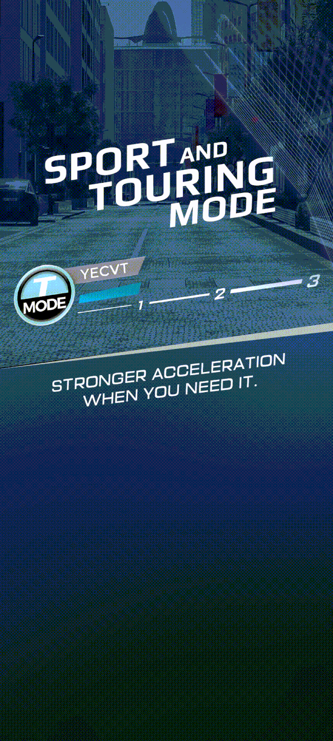 The YECVT enables switching between different ride modes and a downshift feature for the rider to adjust how quickly the Motorcycle accelerates or decelerates. The downshift feature expands the rider's range of control, such as when they want to experience strong acceleration when passing a vehicle in front of them or when they want to use both the brakes and engine braking while executing downhill turns.